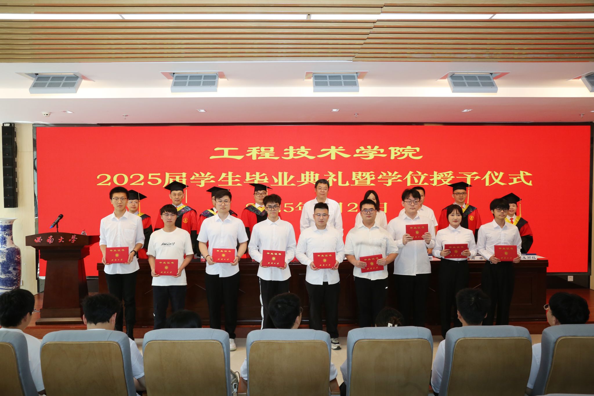 关于表彰2025年优秀毕业生的决定,代表学院向优秀毕业生们表示了热烈祝贺。我院65名本科生、15名研究生被授予优秀毕业生荣誉称号。主席台就坐领导和老师为优秀毕业生代表颁发了荣誉证书。